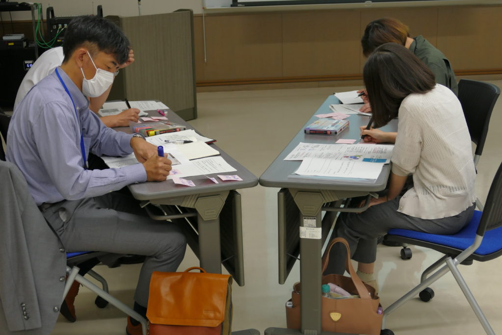 参集が少なかったため、グループではなく、全員で話し合う形をとりました。ひとり一人が現在抱えている悩みを発表し、それをリアルタイムで荻野氏がパソコンに打ち込むことで、参集受講者はもちろん、オンライン受講者も内容を共有することができました。情報交流では、立場の異なるそれぞれの視点から親身に意見を述べ合う場面があり、改めて参集の良さを実感しました。