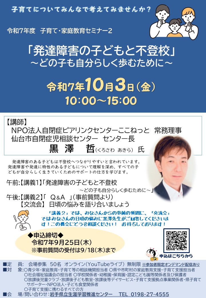 発達障害について理解を深めるとともに、発達障害のある子どもと不登校の関係やサポートの仕方を学び、子育てについてのスキルアップを図る。