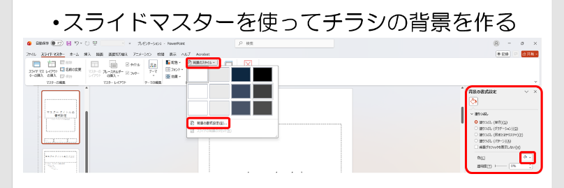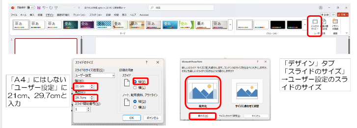PowerPointでA4のチラシを作る際、余白をつくらないようにするために覚えておきたい設定です。